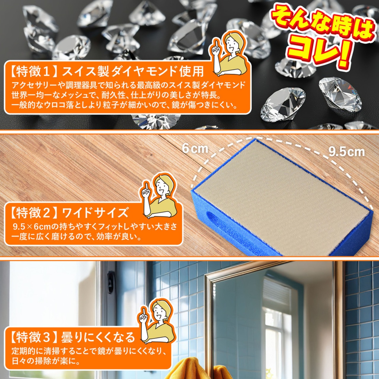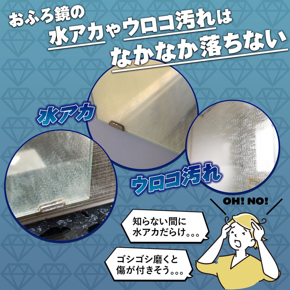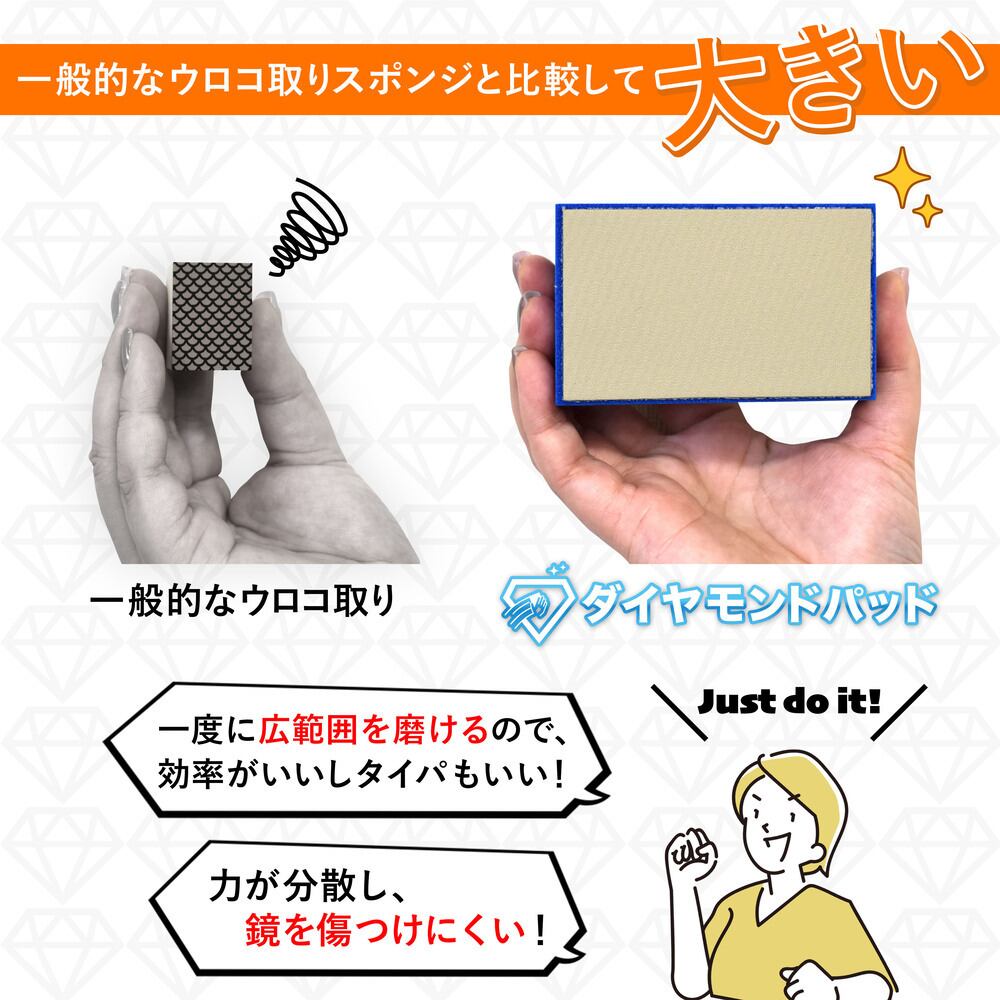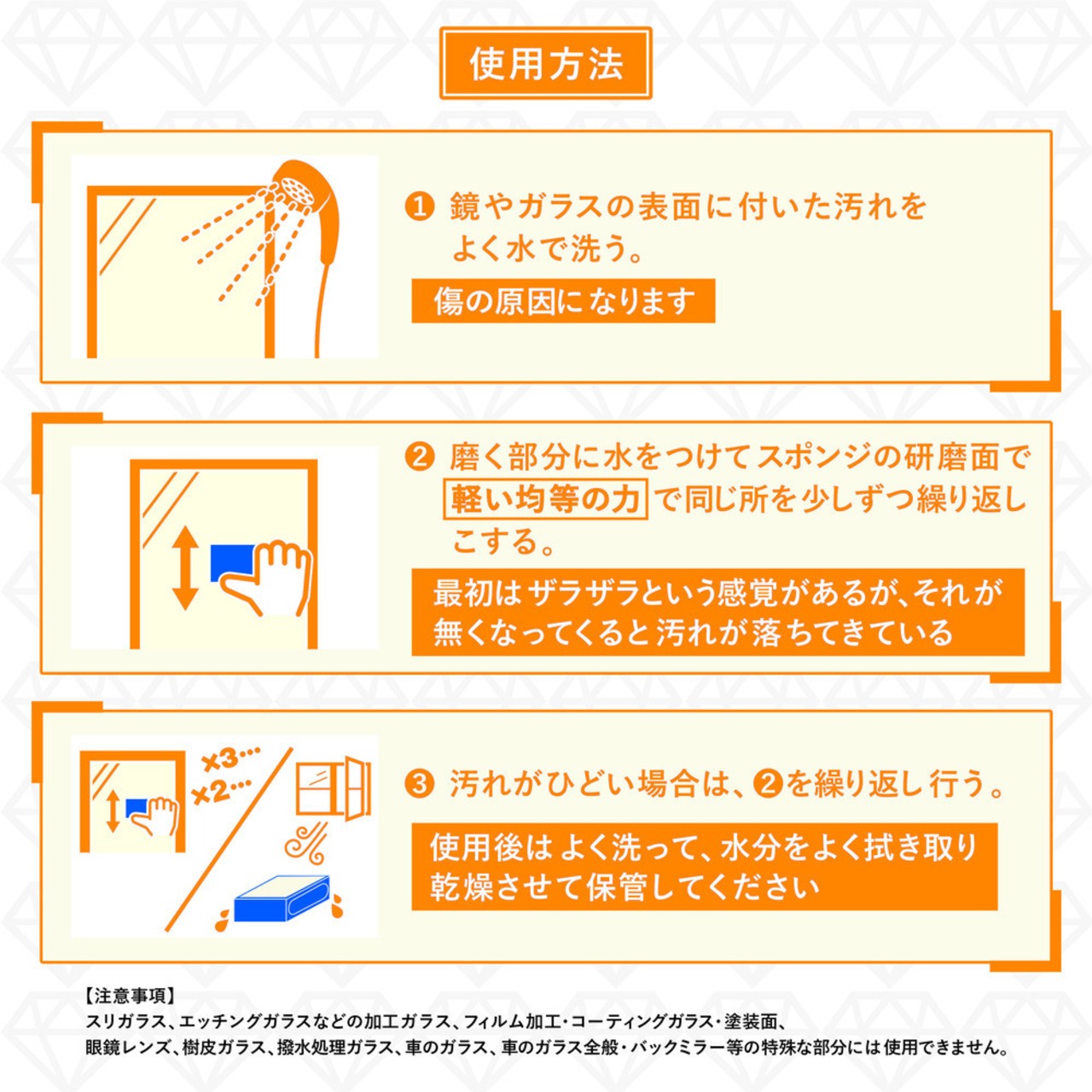 1.作業前に、鏡やガラスの表面に付いた汚れをよく水洗いしてください。(傷の原因になります。)
