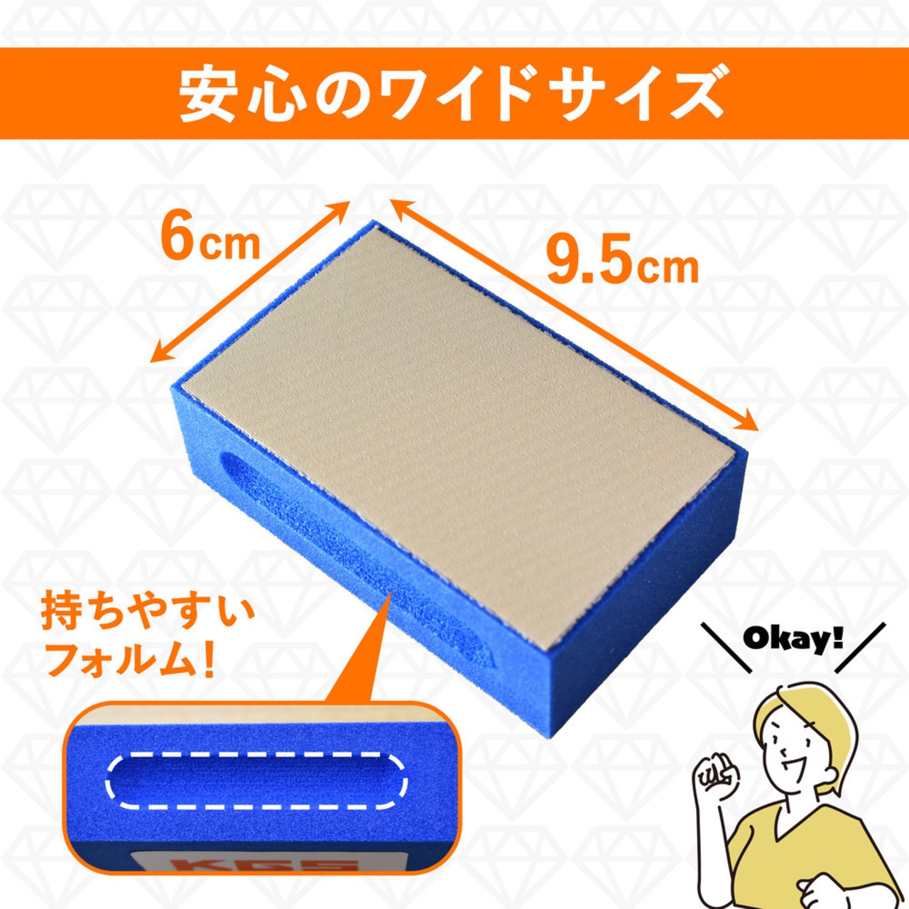 2.磨く部分に水をつけながらスポンジの研磨面で、長い面と平行方向に均等の力で同じところを少しずつ繰り返し擦る。(一気に広域の作業をせず、少しずつ移動するのがコツです。)